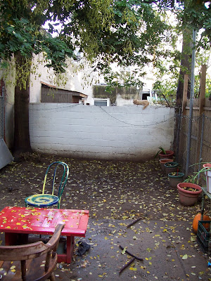 Big old cat on our cinder block fence. The backyard recently drenched. Dogs happy. Did I mention we were listening to